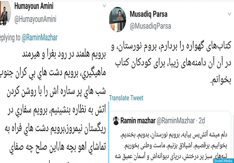 فرشته کریمی، یکی از این کاربران توییتر نوشته است؛ اگر صلح بیاید دوست دارد به تمام افغانستان چهار مغز ببرد و خوشبختی را در چهار سمت افغانستان مساویانه تقسیم کند؛ چهار مغز را بدهد به چهار سمت شمال، جنوب، شرق و غرب و پوستش را دور بیندازند. به چهار سمتی که همیشه از خوشبختی پوست تکیدهی آن را سهم برده اند و جنگ که همیشه مساویانه تقسیم بوده است.